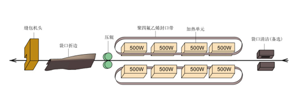 全自動(dòng)編織袋熱封縫合機(jī)作業(yè)流程:袋口清潔(備選)→內(nèi)袋熱封(4組加熱塊加熱:聚四氟乙烯封口帶使加熱塊與袋子不直接接觸,以保護(hù)袋子外表不與加熱塊粘連)→壓輥壓合→袋口折邊→縫包機(jī):外袋縫紉。